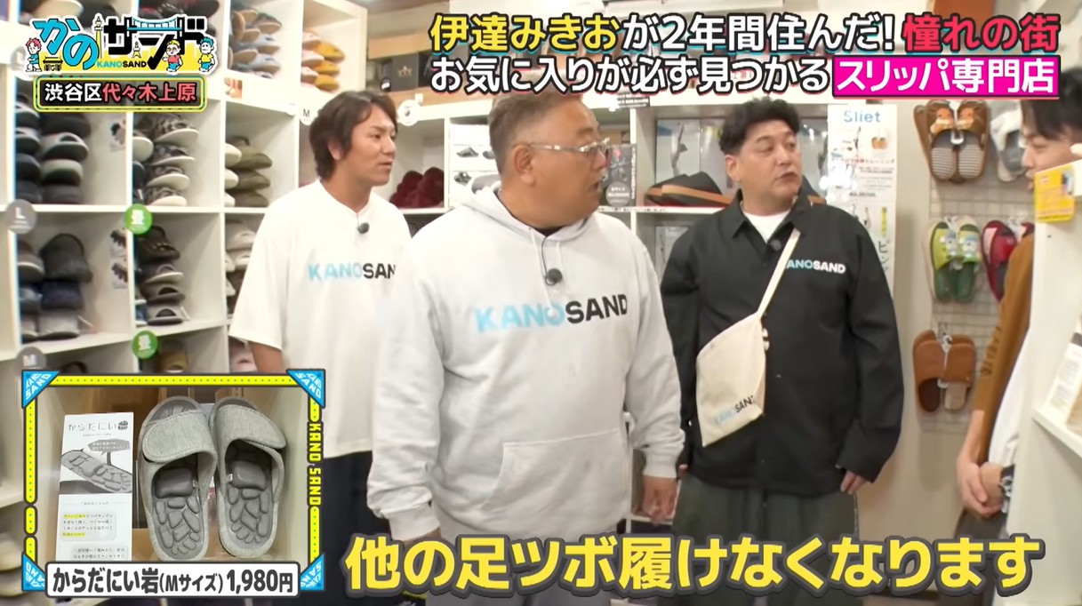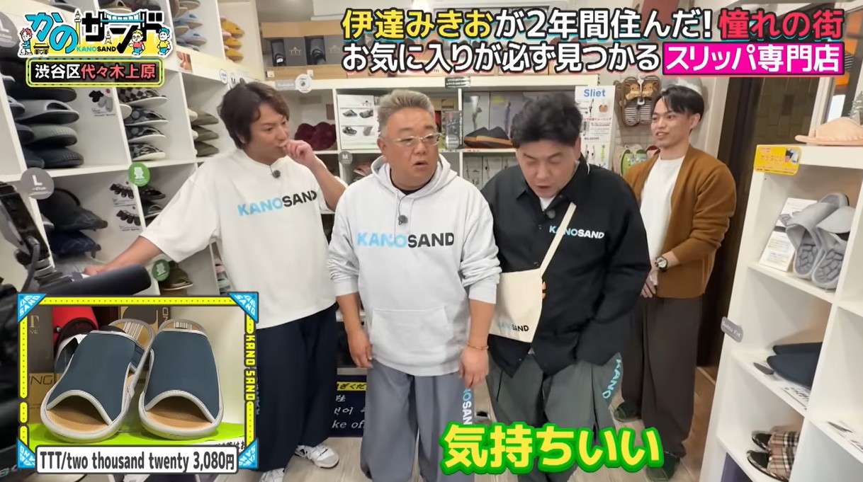 フジテレビのバラエティ番組「かのサンド」にて、「fit it ACTIVE TTT」と「からだにい岩」が紹介されました。 番組内では、サンドウィッチマンのお二人と狩野英孝さんが、代々木上原のスリッパ専門店Tomy’sに来店。実際に商品を履いていただきながら、履き心地や商品の魅力をご紹介くださいました。